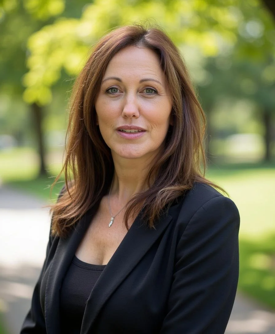 • A woman with long dark hair, wearing a black shirt, stands outdoors in front of greenery, smiling.
